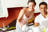 człowiek za pomocą laptopa z kobietą w tle w kuchni