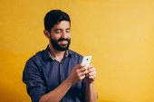 Młody brodaty mężczyzna pracujący w domu. Mężczyzna na kanapie w domu za pomocą tabletu cyfrowego
