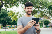 Zdjęcie "Młody brodaty mężczyzna pracujący w domu. Mężczyzna na kanapie w domu za pomocą tabletu cyfrowego" może być wykorzystywane do celów osobistych i komercyjnych zgodnie z warunkami zakupionej licencji Royalty-free. Obraz jest dostępny do pobrania w jakości wysokiej rozdzielczości do 5760x3840.