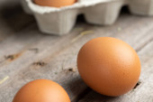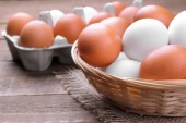 Świeże jaja kurze i kacze jaja na drewnianym tle / białe i brązowe jaja
