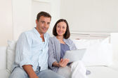 Miłej pary za pomocą laptopa na kanapie