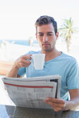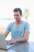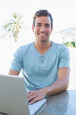 uśmiechnięty mężczyzna w domu za pomocą cyfrowego tabletu