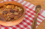 Miska gliny z domowej roboty gulaszem soczewicowym, pomidorem, hiszpańskim chorizo, mięsem i ziemniakami na obrusie