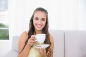 uśmiechający się kobiety picie kawy barista w tle w kawiarni