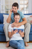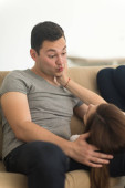 mans miłej kobiety spoczywa na kolanach na kanapie