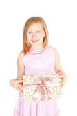 Wesoły Piękna Blondynka W Różowej Sukience Trzymając Pudełko