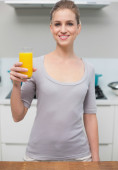 uśmiechający się przytrzymanie sok pomarańczowy z mężczyzną w tle