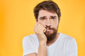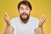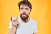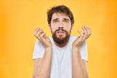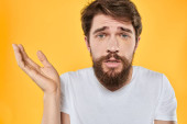 Mężczyzna w białym t-shirt emocje studio gesty z rąk niezadowolony wyraz twarzy żółty tło