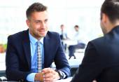 uśmiechający się przedsiębiorców, patrząc na siebie w biurze
