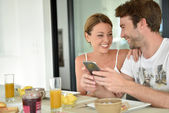 para korzystających z telefonów komórkowych w czasie śniadania