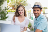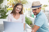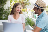 Uśmiechający się para za pomocą cyfrowego tabletu w kawiarni