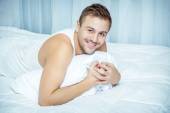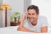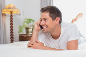 dorywczo zrelaksowany człowiek przy użyciu telefonu komórkowego w łóżku