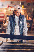 mężczyzna stolarz pracuje w retro vintage warsztat.