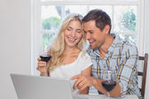 zrelaksowany starsza para, lampkę wina, za pomocą laptopa