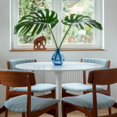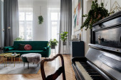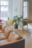 Zdjęcie "Nowoczesne skandynawskie wnętrze domu salonu z designerskimi meblami retro, tropikalną rośliną, oknem, dekoracją i eleganckimi akcesoriami osobistymi w stylowym wystroju domu." może być wykorzystywane do celów osobistych i komercyjnych zgodnie z warunkami zakupionej licencji Royalty-free. Obraz jest dostępny do pobrania w jakości wysokiej rozdzielczości do 5760x3840.