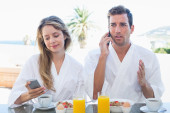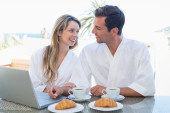 uśmiechnięta kobieta, patrząc na człowieka przy stole śniadanie