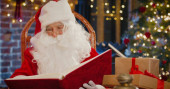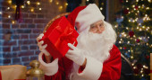 Zbliżenie siwowłosy Święty Mikołaj w okularach patrząc w obiektyw i uprzejmie uśmiechnięty stojąc na ulicy w dobrym nastroju. Koncepcja świątecznego ducha. Grudzień świąteczny nastrój