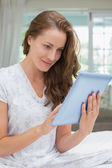 Szczęśliwa młoda kobieta za pomocą cyfrowego tabletu w łóżku