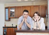 kobieta picia kawy a człowiek w domu przy użyciu telefonów komórkowych