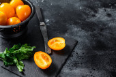 Świeżo pokrojony pomidor wiśniowy na desce do krojenia. Białe tło. Widok z góry