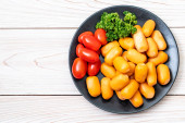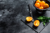 Zdjęcie "Świeżo pokrojony pomidor wiśniowy na desce do krojenia. Białe tło. Widok z góry" może być wykorzystywane do celów osobistych i komercyjnych zgodnie z warunkami zakupionej licencji Royalty-free. Obraz jest dostępny do pobrania w jakości wysokiej rozdzielczości do 5760x3840.