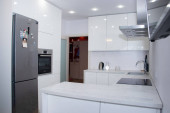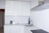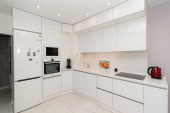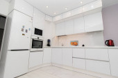 Nowoczesna biała kuchnia. Kuchnia jest z litego dębu. Szczegóły kuchni. Nowoczesne meble kuchenne napełniania. Meble na zamówienie. Projektowanie mieszkania. Meble. Rosja, Sankt Petersburg, nowy budynek, 13 maja 2020