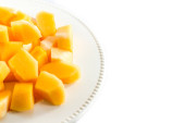 Kawałki żółtego arbuza na białym dysku na białym tle