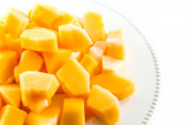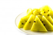 Kawałki żółtego arbuza na białym dysku na białym tle