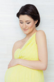 kobieta w ciąży piękny pozowanie, głaszcząc jej brzuch