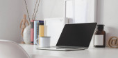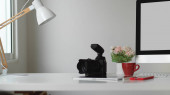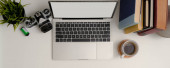 Close up widok obszaru roboczego z laptopem, kubek i dekoracje na drewnianym stole w biurze domu