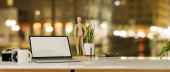 Blisko widok obszaru roboczego z laptopem, kubkiem, pędzlami i dekoracjami na drewnianym stole