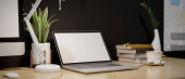 Zdjęcie "Blisko widok obszaru roboczego z laptopem, kubkiem, pędzlami i dekoracjami na drewnianym stole" może być wykorzystywane do celów osobistych i komercyjnych zgodnie z warunkami zakupionej licencji Royalty-free. Obraz jest dostępny do pobrania w jakości wysokiej rozdzielczości do 5760x3840.