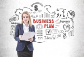 kobieta z planu strategicznego, aby odnieść sukces w swoim biznesie. Biuro tło.