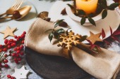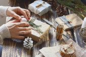 Eleganckie, przytulne pudełka z prezentami na drewnianym tle. Naturalna estetyka. Zero odpadów, plastik darmo, modny ręcznie robiony pakiet prezentów na Boże Narodzenie.