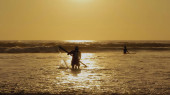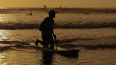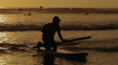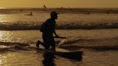 Sylwetka młodego faceta jeżdżącego na desce surfingowej o zachodzie słońca