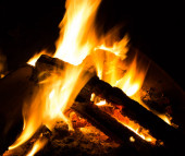 żółte płomienie ognia, płonące drewno w ciemną noc