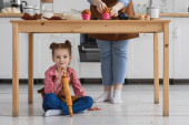 mała dziewczynka w kuchni śmieje się i trzyma babeczki
