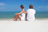 zbliżenie szczęśliwa para młodych w okulary, ciesząc się ich czas na tropikalnej plaży