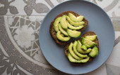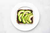 Tło spożywcze z chlebem żytnim i kanapkami z awokado na białym tle.