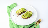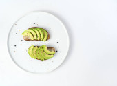 Tło kulinarne z kanapkami z awokado na białym tle z sztućcami i serwetką.