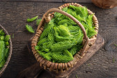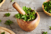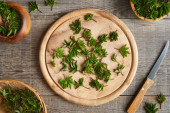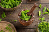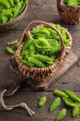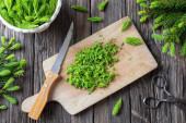 Młode świerkowe końcówki w drewnianej misce - składnik do przygotowania domowej roboty syropu ziołowego na kaszel