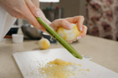 Bliskie zdjęcie dłoni młodej kobiety, która pociera skórką cytryny tarkę w kuchni