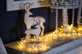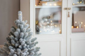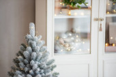 Nowy Rok świąteczny szklany stół nakrycia. Kartka z życzeniami. Na gałęziach choinki są kieliszki do wina i sztućce. Ozdobione złotymi świecami, jeleniami, gwiazdami, kulkami. Odbiór, bokeh jodło