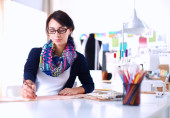 Zdjęcie "Młoda projektantka mody pracująca w studio." może być wykorzystywane do celów osobistych i komercyjnych zgodnie z warunkami zakupionej licencji Royalty-free. Obraz jest dostępny do pobrania w jakości wysokiej rozdzielczości do 5760x3840.