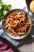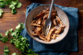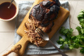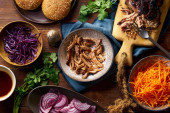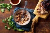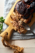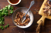 rozdrobniona wieprzowina z sosem barbecue i ziołami w misce na drewnianym tle, widok z góry