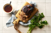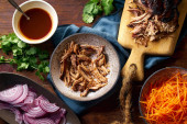 Zdjęcie "rozdrobniona wieprzowina z sosem barbecue i ziołami w misce na drewnianym tle, widok z góry " może być wykorzystywane do celów osobistych i komercyjnych zgodnie z warunkami zakupionej licencji Royalty-free. Obraz jest dostępny do pobrania w jakości wysokiej rozdzielczości do 5760x3840.