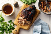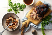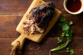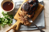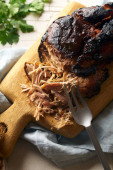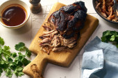 rozdrobniona wieprzowina z sosem barbecue i ziołami w misce na drewnianym tle, widok z góry