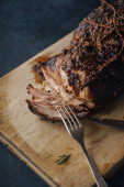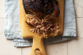 Widok góry ciągniętej wieprzowiny z sosem barbecue i ziołami na drewnianej desce do krojenia