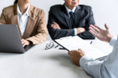 Zdjęcie "Przycięty widok na gestykulację wykonawczą siedząc w miejscu pracy w pobliżu zamazanego afrykańskiego biznesmena na pierwszym planie" może być wykorzystywane do celów osobistych i komercyjnych zgodnie z warunkami zakupionej licencji Royalty-free. Obraz jest dostępny do pobrania w jakości wysokiej rozdzielczości do 5760x3840.