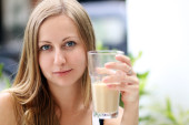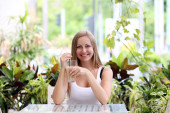 młoda kobieta picia kawy w kawiarni na świeżym powietrzu